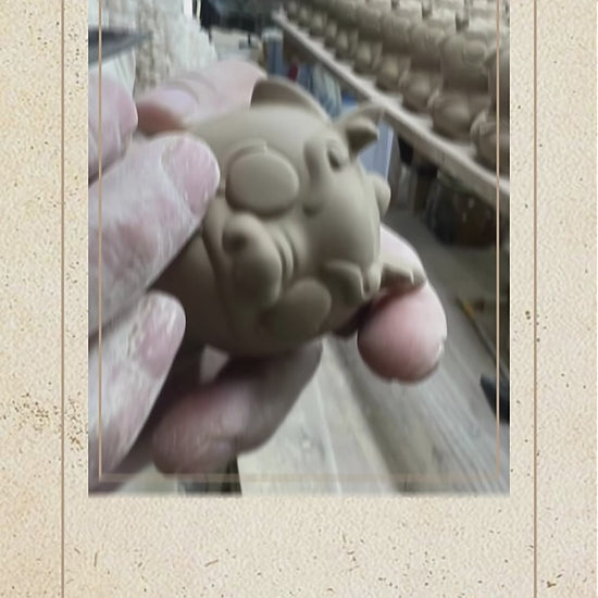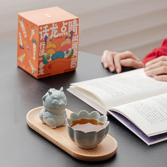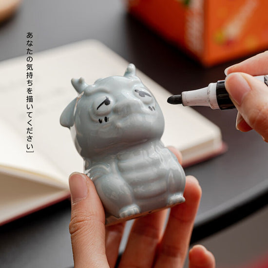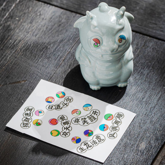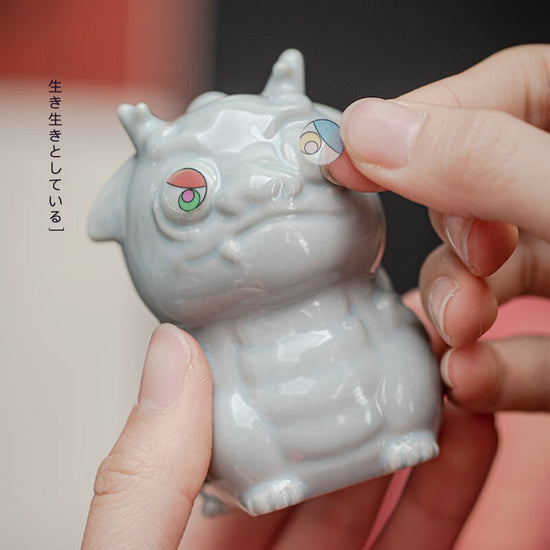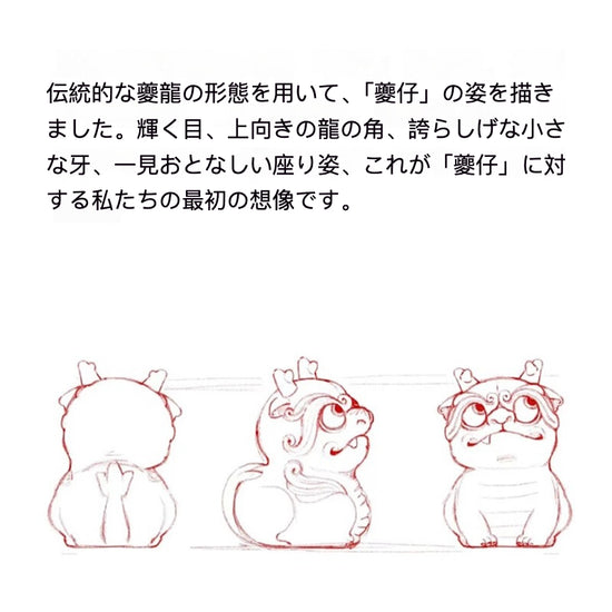 輝く目、上向きの龍の角、誇らしげな小さな牙、一見おとなしい座り姿。