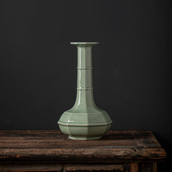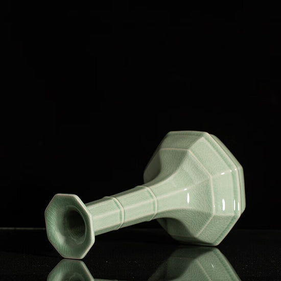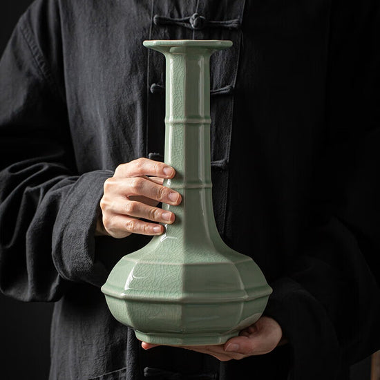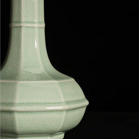 まめあお釉(まめあおゆう)八方弦紋口瓶 名匠による古代風手作り置物